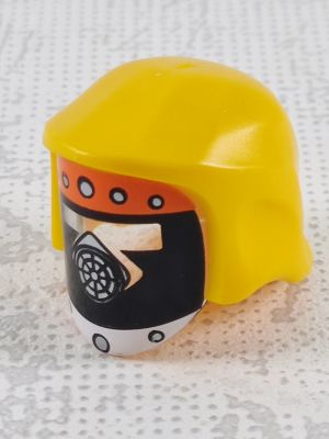 gelber Helm mit schwarz/bunten Visier