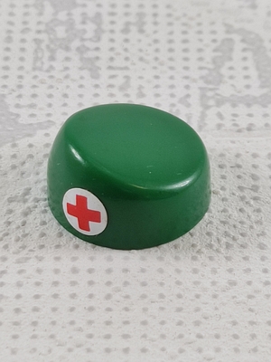 Arztkappe mit rundem Aufkleber: rotes Kreuz auf weißem Hintergrund