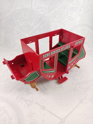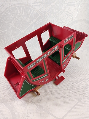 7-teiliges, rotes Kutschengestell mit hellbraunen Achsen, grünen Sitzbänken und Aufklebern
