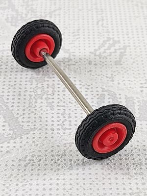 silberne Wagenachse mit roten Felgen und schwarzen Reifen, Gepäckanhänger, Kutsche - ca. 5 cm