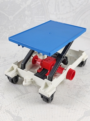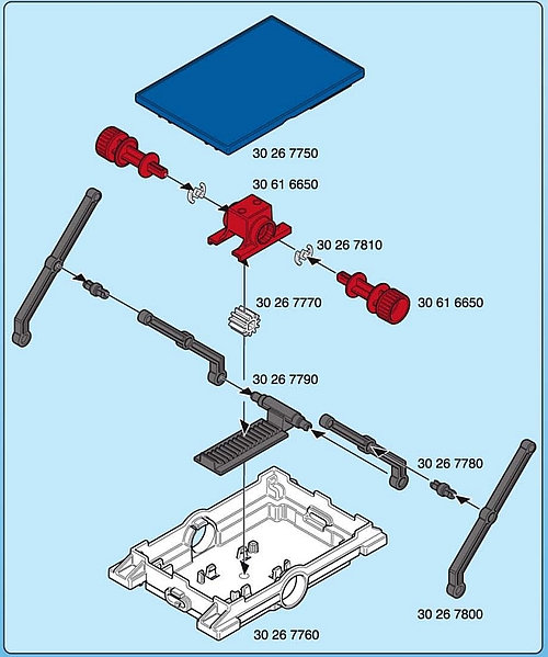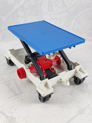 Basis, Chassis weiß: 30267760, Rad Halter grau: 30218810, Rad grau: 30273380, Ladeplatte blau: 30267750, Anhängerkupplung weiß: 30271780, Scherenhub-Kurbel 2-teilig rot: 30616650, Scherenhub-Kurbel Innenteil weiß: 30267810, Zahnrad weiß: 30267770, Scherenhub Basis mit Rillen schwarz: 30267790, Scherenhub-Arm schwarz: 30267800, Scherenhub-Arm Verbinder schwarz: 30267780