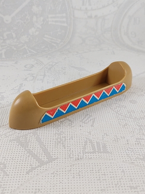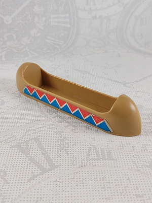 beiges Kanu mit rot/blau/weißen Aufklebern