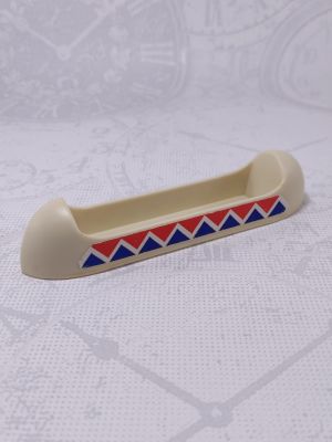 weißes Boot mit Aufklebern auf beiden Seiten: Zierstreifen rot-blaue Dreiecke (mit Gebrauchsspuren)