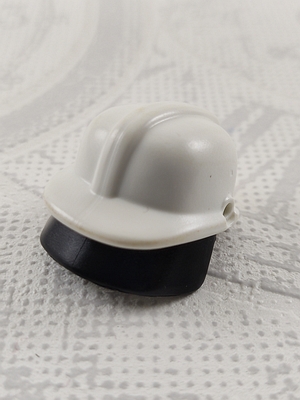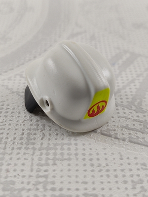weißer Helm mit schwarzem Nackenschutz und gelb/rotem Flammen-Logo