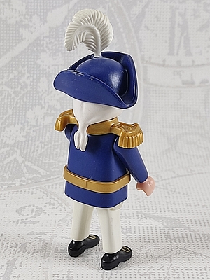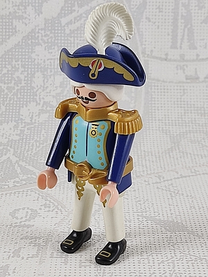 Soldat in d.blauer Uniformjacke mit h.blauer Front, goldene Knöpfe, goldene Schulterklappen und Gürtel, Hut mit Feder, aufgedruckter Schnäuzer