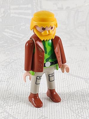 Mann in brauner Jacke über einem grünen Pulli, graue Hose, braune Stiefeln, blond mit Bart