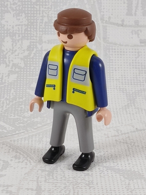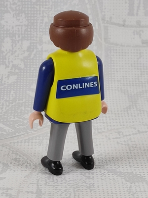 Mann, gelbe Weste mit Rücken-Aufdruck "CONLINES", d.blauer Pulli, graue Hose