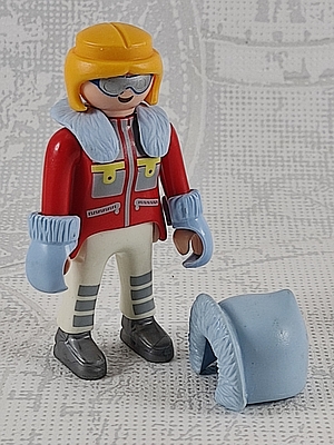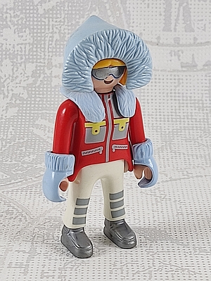 Wissenschaftlerin mit h.blauer Fellmütze, Fellkragen und Handschuhen; aufgedruckte Sonnenbrille
