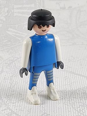 Mann in blauer Kleidung mit silbernen Streifen auf den Beinen, silberne Hände, weiße Arme und Stiefeln