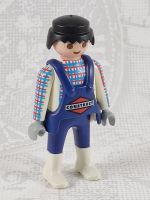 Arbeiter in blauer Latzhose mit Aufdruck "CONSTRUCT", karierter Pulli, aufgedruckte silberne Brille - graue Hände