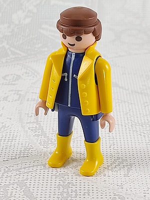 Mann in gelber Jacke und Stiefeln, dunkelblaue Hose