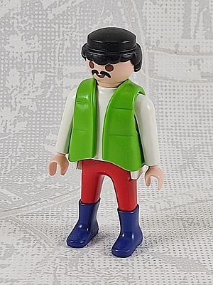 Mann in grüner Weste, weißer Pulli, rote Hose, d.blaue Stiefel, aufgedruckter Schnäuzer