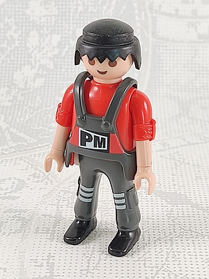 Bauarbeiter mit Latzhose, Aufdruck "PM", roter Pullover, hochgekrempelte Ärmel
