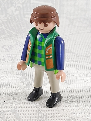 Mann in dunkelgrüner Weste, grün-blau karierter Pulli