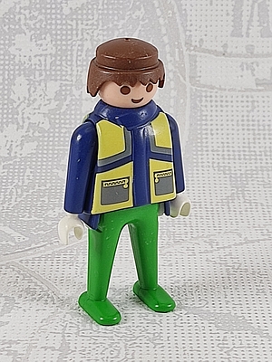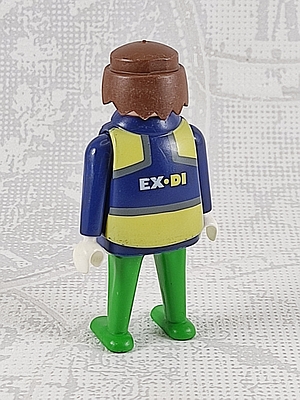 Wissenschaftler in Blau/gelber Jacke mit Rücken-Aufdruck "EX-DI", grüne Hose, weiße Hände