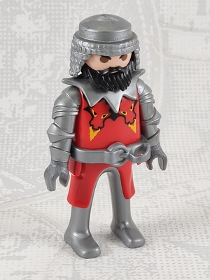 Drachenritter, roter Oberkörper mit Drachen-Aufdruck, silberne Arme, Beine, Schulterkragen, Gürtel und Haare, schwarzer Bart