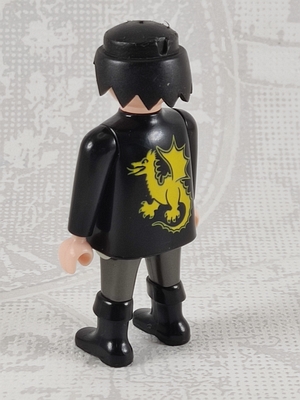 Mann in schwarz/grauer Kleidung mit gelben Drachenaufdruck auf dem Rücken - schwarze Haare