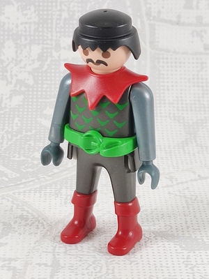 Ritter, grauer Pulli mit grünen Zacken, roter gezackter Kragen, grüner Gürtel, rote Stiefeln, graue Hände