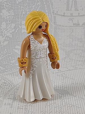 Fee mit langem, blonden Haarzopf, goldene Armreifen mit Ornamenten, langes Kleid mit freiem Rücken
