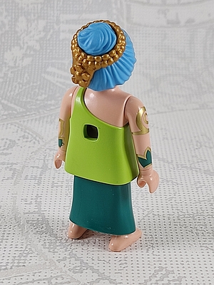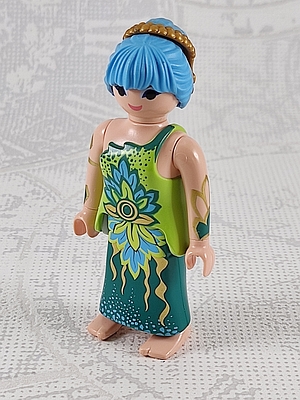 Frau mit Tätowierungen auf den Armen, Haare blau, Haarschmuck gold, Kleid grün, mit Öffnung für Flügel auf dem Rücken