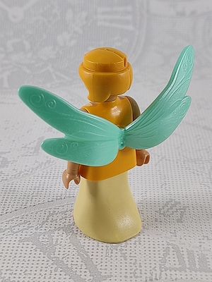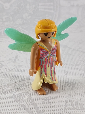 Frau in langem, gelben Kleid mit Streifen und Punkten, Flügel-Stecköffnung auf dem Rücken, mit Libellenflügel mint