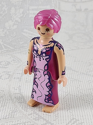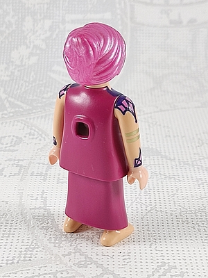 Frau mit Tätowierungen auf den Armen, Haare pink, Kleid magenta/pink, mit Öffnung für Flügel auf dem Rücken
