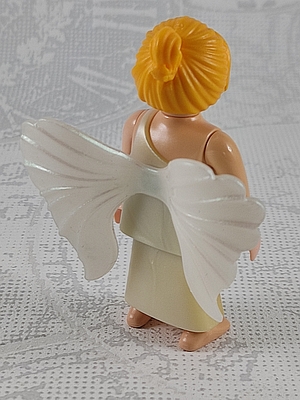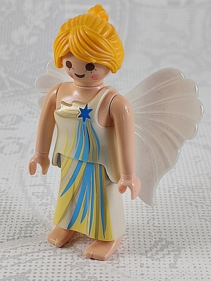 Engel mit Flügeln, weißes Kleid mit hellblauen und gelben Streifen, barfuß