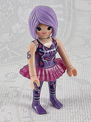 Frau mit lila Haaren, lila gekleidet, Minirock