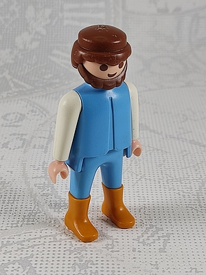 Mann mit Bart, hellblaues Top und Hose, weiße Ärmel, hellbraune Stiefeln