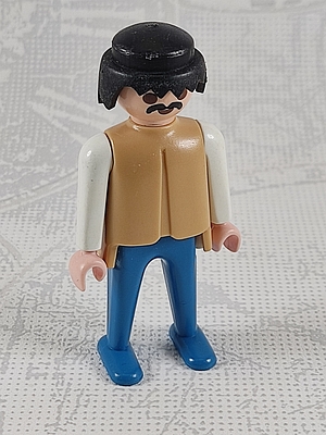 Goldwäscher, Schnäuzer, beiger Oberkörper, weiße Arme, blaue Beine