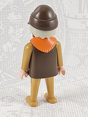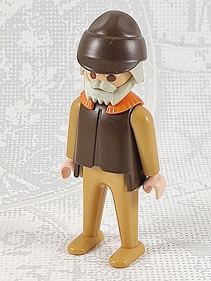 Goldgräber, Trapper, braune Kleidung, d.brauner Hut / Mütze, oranger Kragen, graue Haare und Bart