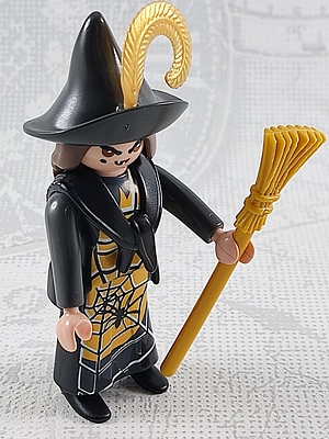 Hexe mit Hut, Hutfeder, Halstuch und Besen - Kleid-Aufdruck: Spinnennetz und Spinne