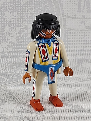 Indianer in cremefarbender Kleidung mit blauem Gürtel und Halsschmuck, Gesichtsbemalung