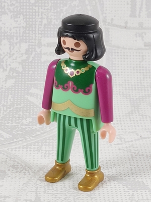 König, Oberteil grün/magenta, Ärmel magenta, Hose grün gestreift, aufgedruckter Schnäuzer