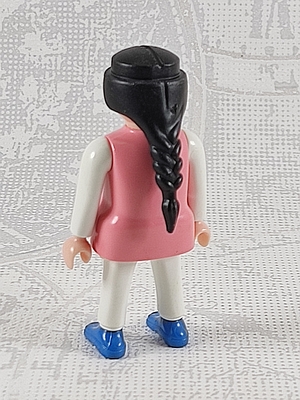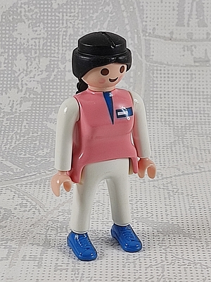 Frau rosa Oberkörper, weiße Arme und Beine, blaue Schuhe
