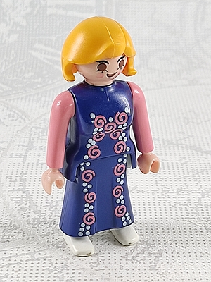 Frau im langen, dunkelblauen Kleid mit rosa Kringeln und Ärmeln
