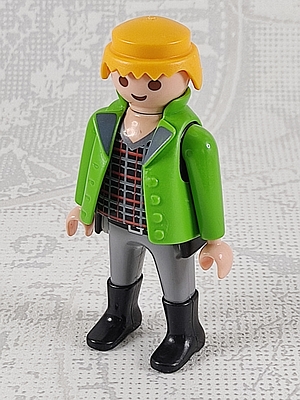 Mann mit kariertem Pulli, h.grüner Jacke, graue Hose