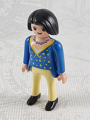 Frau in blauem Pulli mit gelben Punkten, hellgelbe Hose