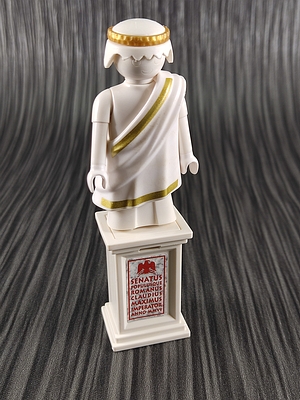 Römer Figur mit weißen Hände, weiß/goldener Toga und goldenem Haarband auf weißem Sockel mit Aufkleber "Senatus"