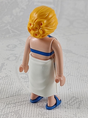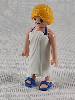 Frau im blauen Bikini mit Handtuchkleid (abnehmbar), blaue Badelatschen, blonde Hochsteckfrisur