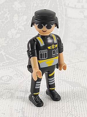 Polizist mit Sonnenbrille, Kleidung schwarz/grau/gelb, hochgekrempelte Ärmel