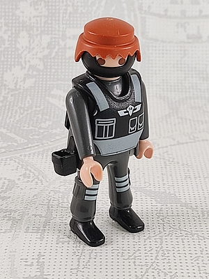Polizist, Kleidung schwarz/grau, schwarze Maske, rot-braune Haare