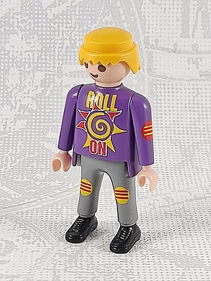 Mann, lila Pulli mit Aufdruck "ROLL ON", graue Hose mit gelb/rotem Knieschutz
