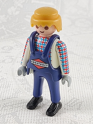 Arbeiter in dunkelblauer Latzhose mit Aufdruck: "Construct", karierter Pulli, hellgraue Hände