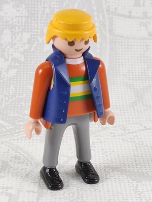 Mann in d.blauer Weste, brauner Pulli mit bunten Streifen, graue Hose