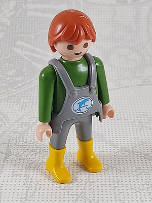 Zoowärter, graue Latzhose mit aufgedrucktem Delfin-Logo, grüner Pulli, gelbe Stiefeln, rot-braune Haare