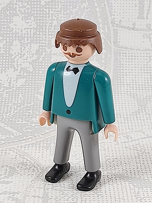 Mann in d.grüner Jacke mit aufgedruckter schwarzer Fliege - aufgedruckter Schnäuzer