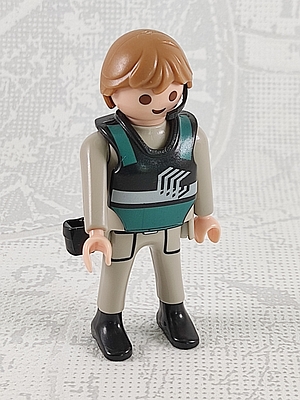 Wache, Fahrer Geldtransporter, schwarze Weste mit grau und d.grün, h.graue Hose, inklusive Kopfmikrofon und Pistolenholster