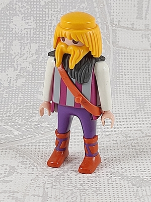 Mann mit magenta/grau gestreifem Oberkörper, weiße Arme, grauer Fellkragen, lila Hose, blonde Haare und Spitzbart, brauner Schultergurt