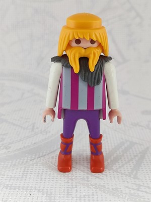 Mann mit magenta/grau gestreifem Oberkörper, weiße Arme, grauer Fellkragen, lila Hose, blonde Haare und Spitzbart